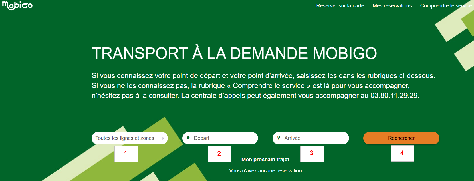 Je connais ma ligne et ma destination : je saisis mes informations (ligne (1), point de départ (2), point d’arrivée (3) dans les champs prévus puis je clique sur « rechercher » (4).