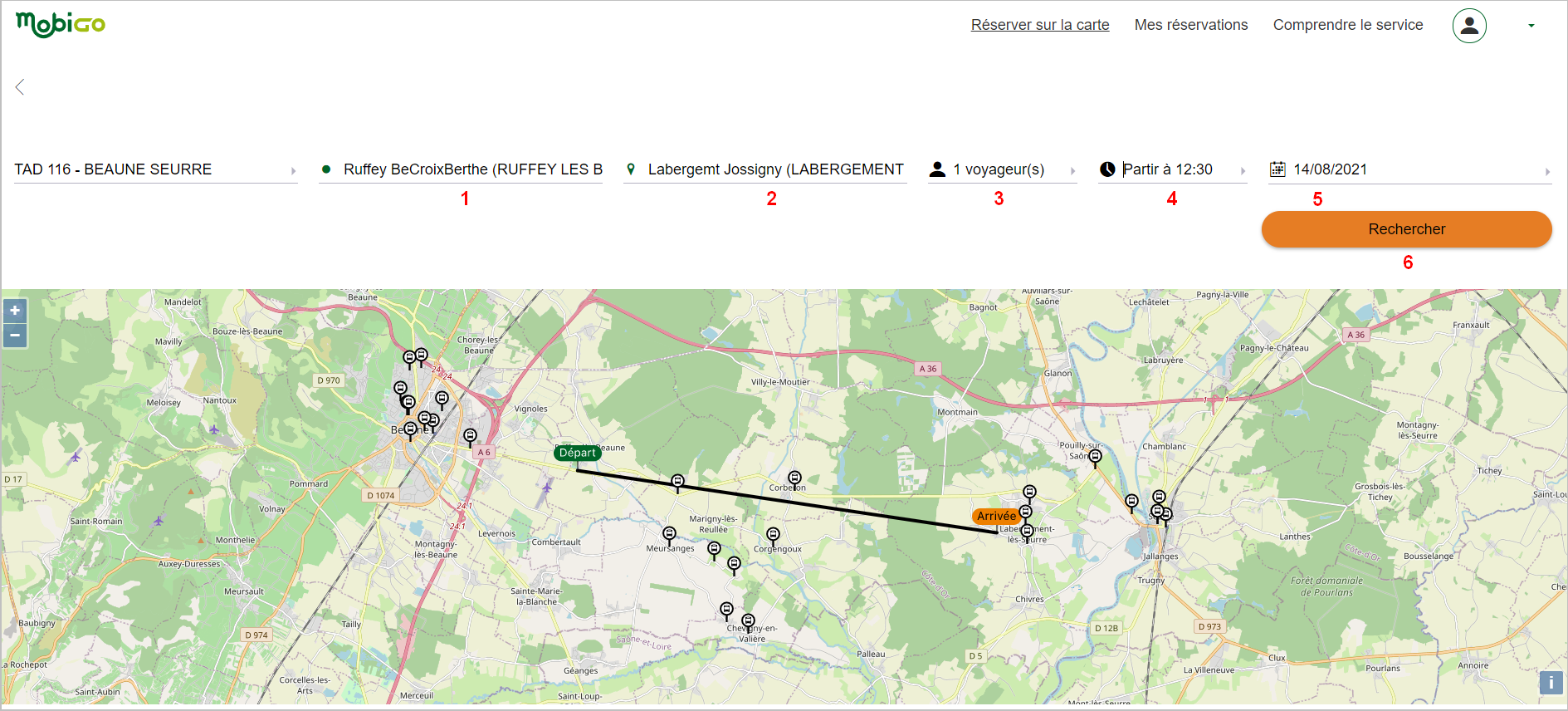 A l’écran s’affiche la ligne que j’ai sélectionnée. Je clique sur mon point d’arrêt de départ et je sélectionne « départ » (1) ; je clique sur mon point d’arrêt d’arrivée et je sélectionne « arrivée » (2). J’indique le nombre de voyageurs (3) ainsi que l’heure (4) et la date (5) de mon voyage et je clique sur « rechercher » (6).
